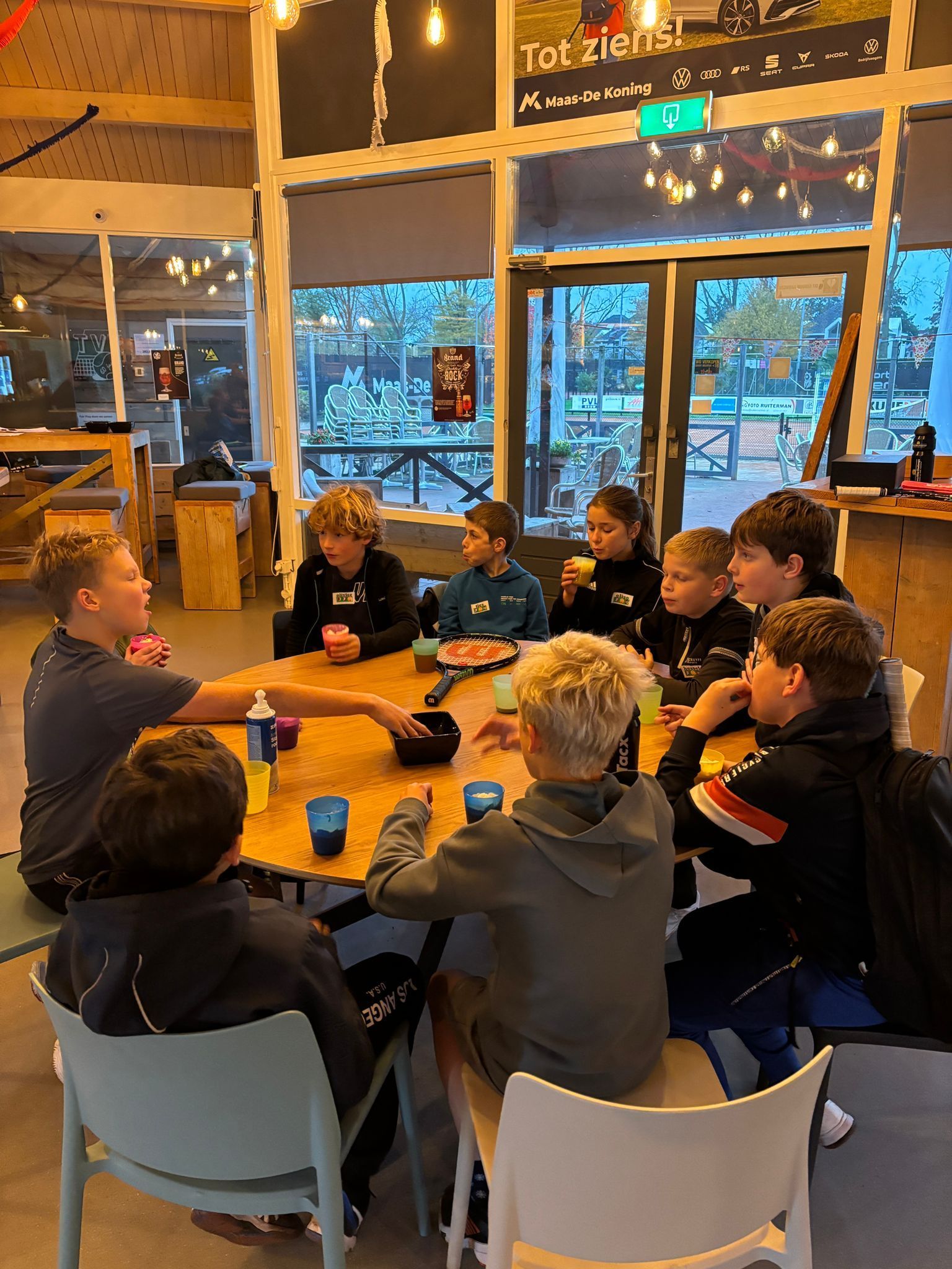 Om 18 uur was de afsluiting en kreeg iedereen een choco sinterklaas daarna werden de kinderen opgehaald. En was het de beurt aan de oudere kinderen om te gaan tennissen. Eerst gezellig met elkaar eten (broodjes knakworst en patat) en daarna sportieve tennispotjes. Altijd leuk om eens tegen en met iemand anders te spelen. Het avondprogramma voor geel was om 21 uur afgelopen en voor iedereen was er een choco letter. Het was een geslaagde middag/avond!