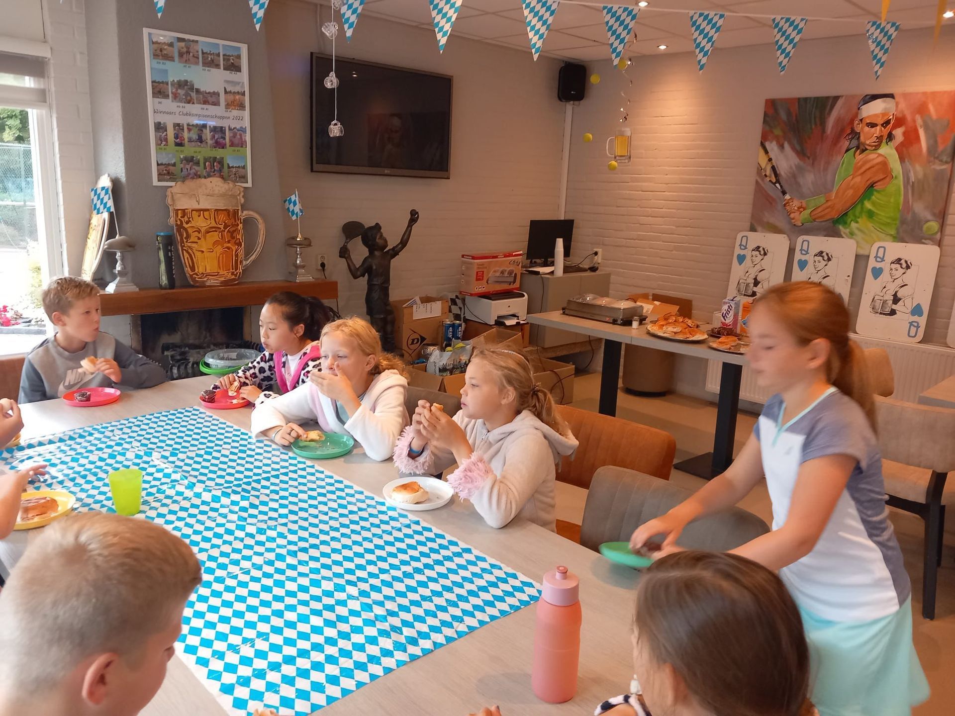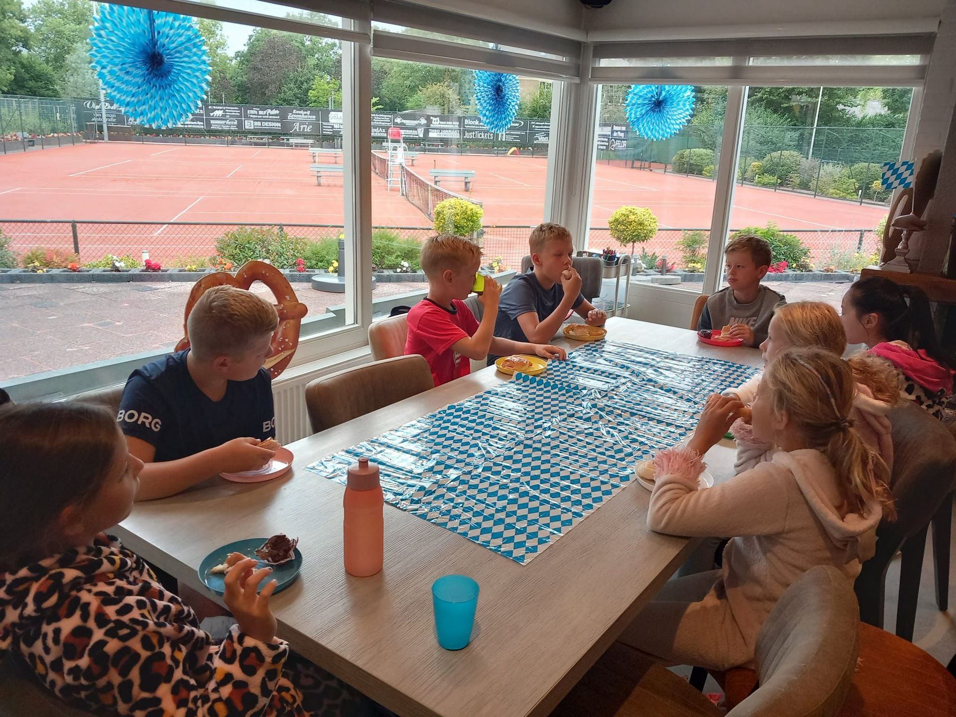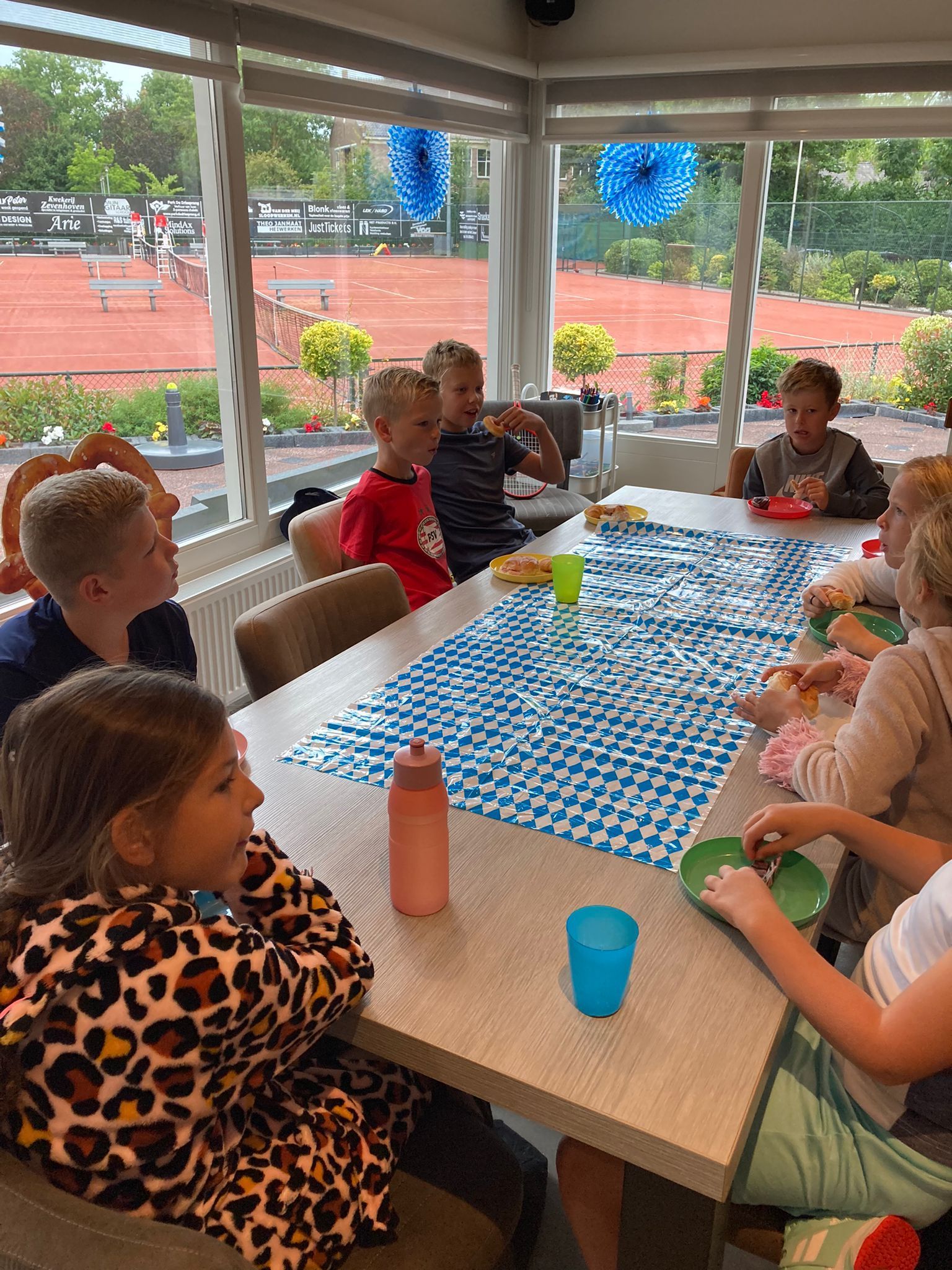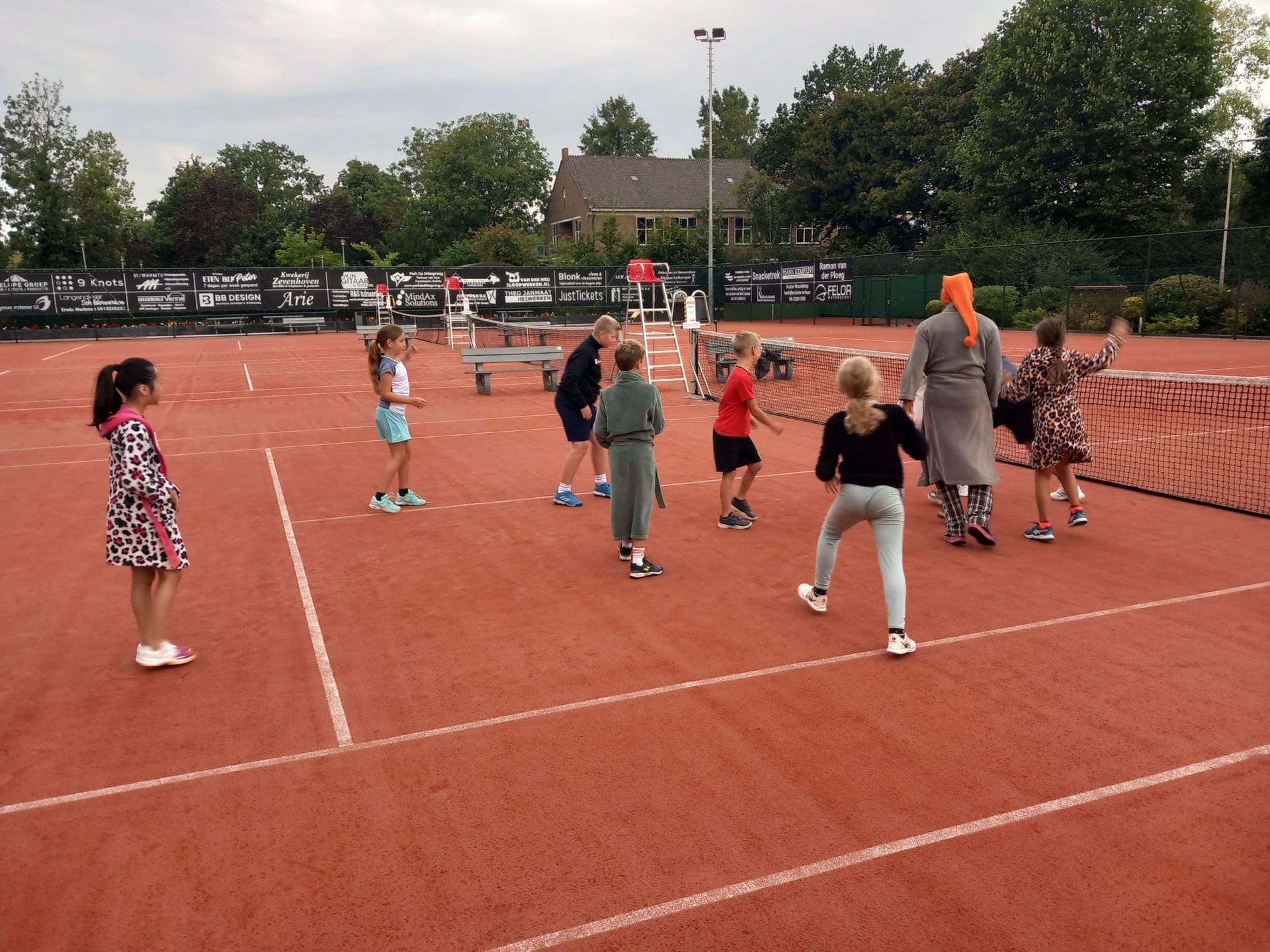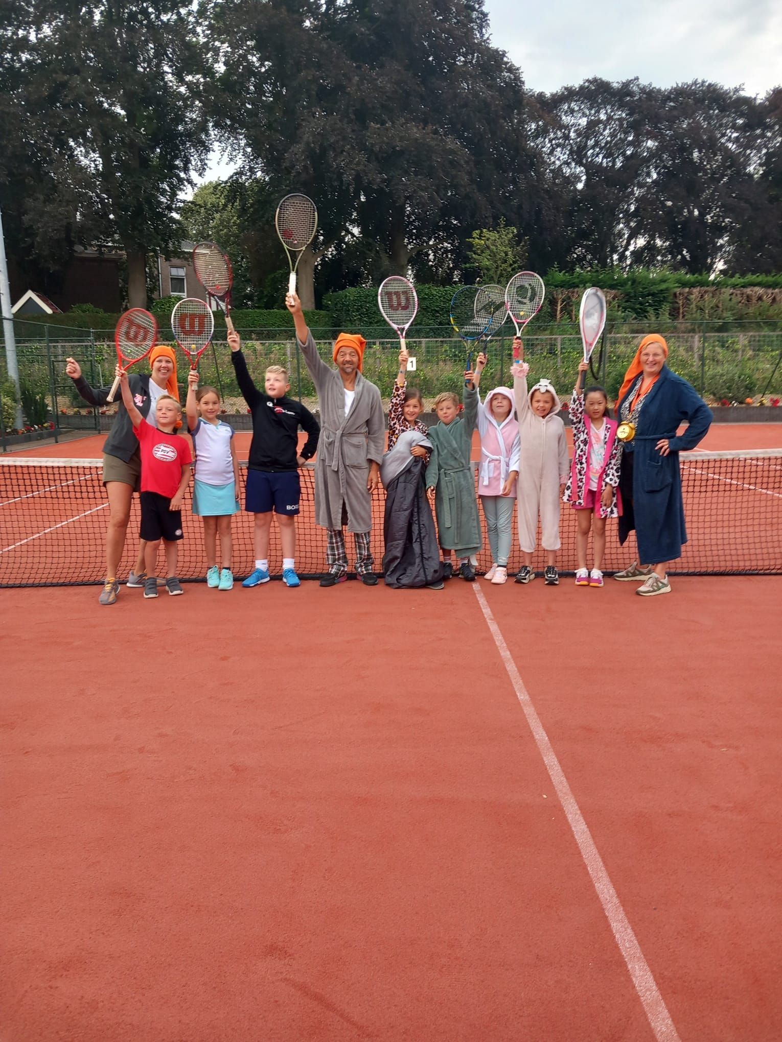 De eerste editie van het vroege vogeltoernooi stond op de planning. Acht sportieve jongens en meisjes waren om klokslag 8 uur bij de tennis. Ze waren zo uit bed gestapt en gelukkig mochten ze hun pyjama’s en badjassen aanhouden….